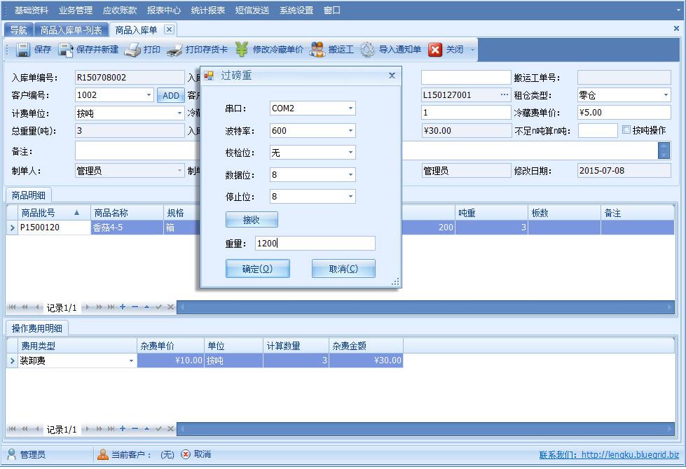傲藍冷凍庫管理軟件,地磅重量數據采集功能即冷庫租賃系統對商品出入庫貨物進行重量數據的采集,冷庫利用地磅對商品進行稱重,地磅顯示屏自動顯示貨物重量,系統自動采集顯示屏重量數據,錄入到出入庫功能模塊中。