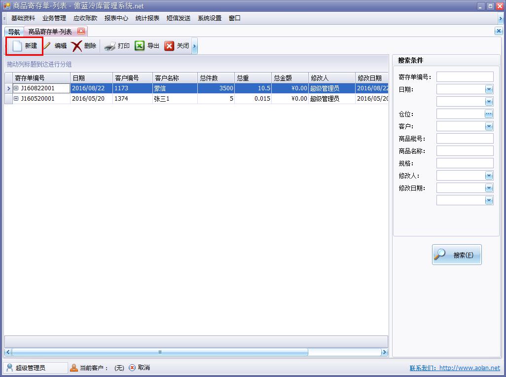 傲藍(lán)冷庫倉儲(chǔ)管理軟件寄存模塊即商品寄存單,界面與商品入庫單相似,冷庫倉儲(chǔ)管理軟件可分倉庫,按照商品批號(hào)或者商品編號(hào)進(jìn)行入庫寄存。