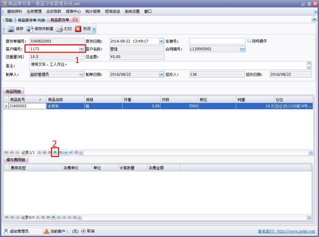 寄存單的操作一般針對(duì)小批量商品的寄存,較多的是針對(duì)冷庫企業(yè)熟客才采用此模塊,商品入庫但不收取客戶的商品冷藏費(fèi)。冷庫業(yè)務(wù)頻繁,通常會(huì)出現(xiàn)一些熟客想要臨時(shí)冷藏一些極小批量的商品,那么冷庫對(duì)于這種情況可能只會(huì)收取一些必要的雜費(fèi), 而不收取小批量商品入庫后產(chǎn)生的冷藏費(fèi)。