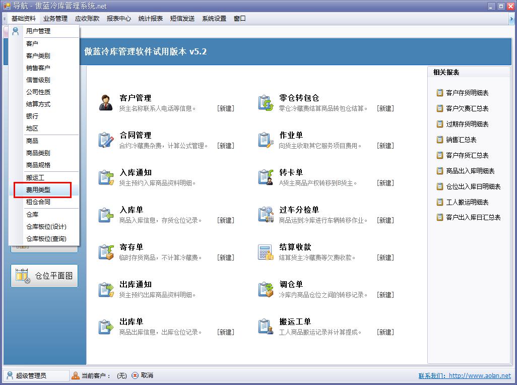 傲藍冷庫管理軟件,費用類型自行設定是系統用戶可根據自身冷庫的實際業務情況,自由設定冷庫業務會涉及到的各項費用,例如:冷藏費與其他各項雜費。