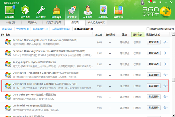 1、電腦安裝了360安全衛士,360優化加速有一個分布式鏈接跟蹤客戶端,是用來斷絕外面數據的傳入;可以選擇“優化加速”中的啟動項——接著找到“分布式傳輸協調服務”——主要是看下此項目是否啟動。禁用的話就要在右邊點擊“恢復啟動”,“已禁用”,點恢復啟動。這一步完成了還不能完全把問題解決了360一鍵優化也會直接影響到電腦系統里面的分布式協調器的運行。