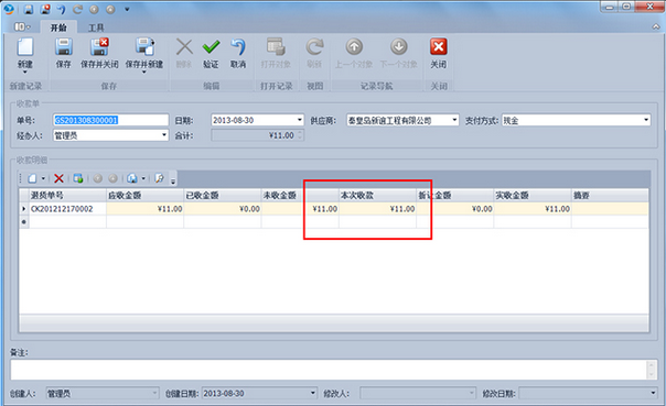 第2步、選中需要收款的供應商退貨單,點擊工具欄的“收款”按鈕,彈出新建供應商退貨收款單界面,此時系統(tǒng)已經根據所選的供應商退貨單填寫好對應的供應商退貨收款單,您只需根據實際需要修改明細中的本次收款的金額即可。
