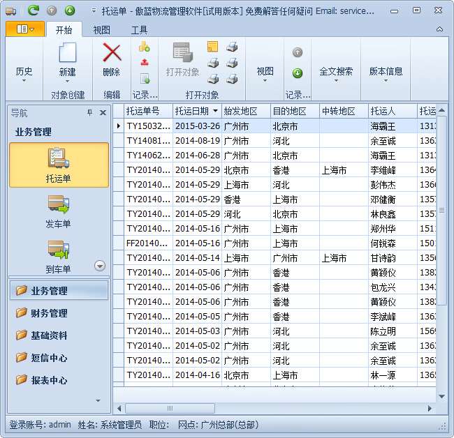 那么如何快速查找這個單子呢?其實很簡單,只要在工具欄的“全文搜索”框中輸入單號,馬上就可以找到目標,不僅在托運單中可以用全文搜索,在其它功能中一樣可以使用全文搜索快速查找目標。